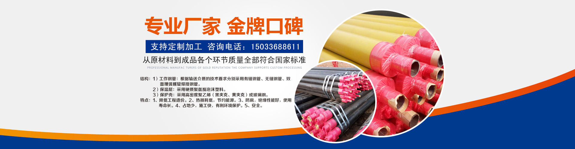 河北興松實(shí)業(yè)有限公司主營(yíng):預(yù)制直埋保溫管,鋼套鋼直埋保溫管,預(yù)制鋼套鋼保溫管,預(yù)制直埋熱水保溫管(件),預(yù)制直埋蒸汽保溫管(件),預(yù)制架空聚氨酯鍍鋅保溫管.公司自成立至今始終堅(jiān)持技術(shù)領(lǐng)先、服務(wù)到位的產(chǎn)品宗旨,建立了一支由高素質(zhì)的專業(yè)技術(shù)人員和企業(yè)管理人員構(gòu)成的企業(yè)運(yùn)營(yíng)團(tuán)隊(duì)。我公司從國(guó)內(nèi)外引進(jìn)了大批先進(jìn)的生產(chǎn)、檢驗(yàn)設(shè)備,使企業(yè)的生產(chǎn)能力、生產(chǎn)規(guī)模、技術(shù)保障與質(zhì)量控制水平始終居于國(guó)內(nèi)同行業(yè)前列。